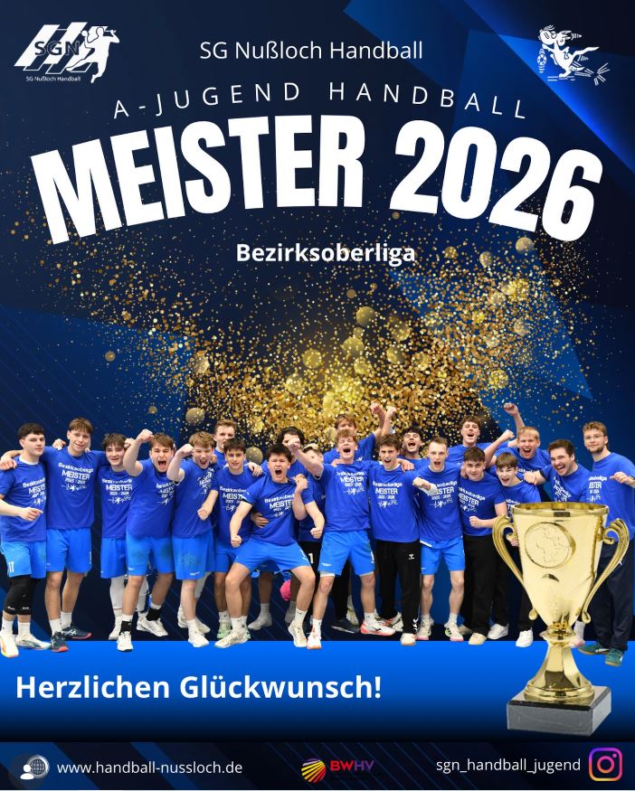 (sgn 21.3.26) Mit einer beeindruckenden Leistung hat sich die männliche A-Jugend der SG Nußloch Handball die Meisterschaft in der Bezirksoberliga gesichert. Im entscheidenden Heimspiel setzte sich das Team deutlich mit 49:26 gegen die TSG Germania Dossenheim durch.