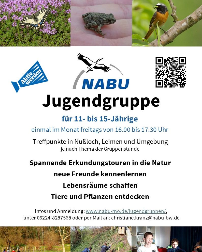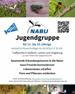 (nabu 4.2.26) Die NABU-Ortsgruppe Leimen-Nußloch bietet mit ihrer Jugendgruppe „Action for Nature“ ein spannendes Programm für 11- bis 15-jährige Natur-Entdecker*innen. Unter fachkundiger Anleitung gehen die Jugendlichen nach draußen, erkunden heimische Tier- und Pflanzenarten und gestalten aktiv neue Lebensräume. Wer Lust hat, die Natur vor der eigenen Haustür kennenzulernen und zu schützen, ist herzlich eingeladen.