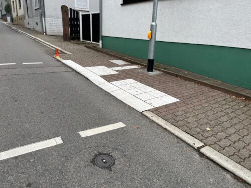 Diese kleine Stufe erfüllt eine wichtige Funktion: Für blinde und sehbehinderte Menschen dient sie als tastbare Orientierungshilfe. Mit dem Langstock ist spürbar, wo der sichere Gehweg endet und die Fahrbahn beginnt – eine klare, verlässliche Abgrenzung.