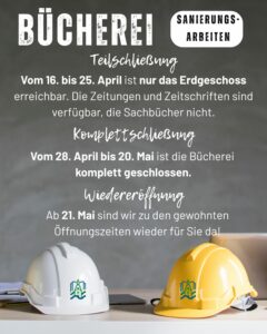 Im Anschluss folgt eine vollständige Schließung der Bücherei. Vom 28. April bis einschließlich 20. Mai bleibt die Einrichtung wegen der laufenden Sanierungsarbeiten komplett geschlossen.