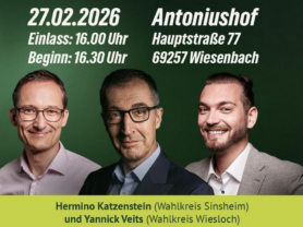 Gemeinsam mit den Landtagskandidaten Hermino Katzenstein (Wahlkreis Sinsheim) und Yannick Veits (Wahlkreis Wiesloch) spricht Özdemir über zentrale Zukunftsfragen – von wirtschaftlicher Entwicklung über Bildungspolitik bis hin zur Stärkung der Demokratie.