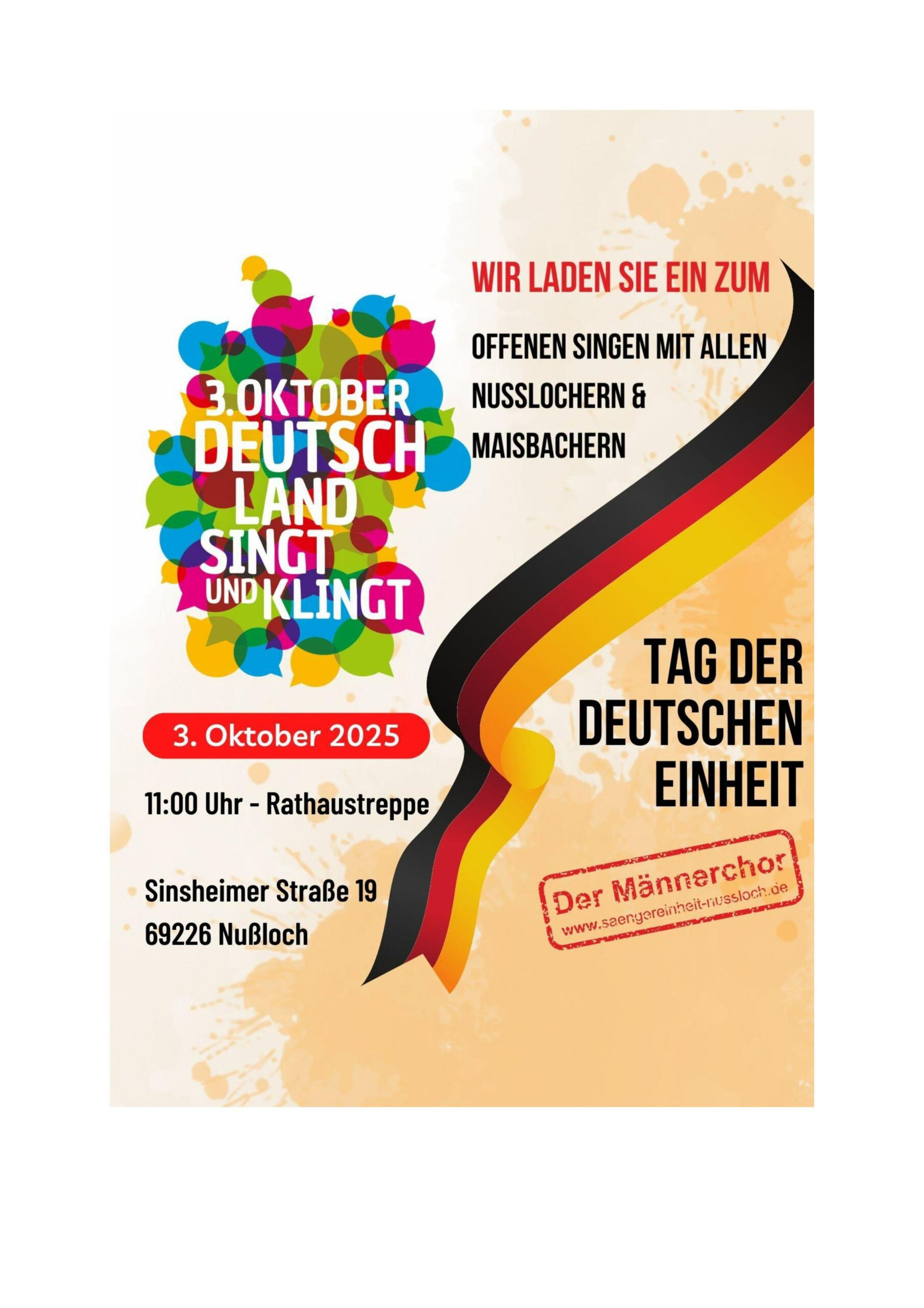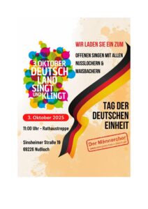 Der Männerchor aus Nußloch lädt am 03. Oktober, dem Tag der Deutschen Einheit, zum 4. Mal zu einem gemeinsamen offenen Singen vor dem Rathaus Nußloch ein.