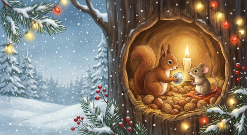 Am heiligen Abend saß Lars in seiner warmen Höhle und lauschte dem Pfeifen des Windes, als es plötzlich leise an die Rinde klopfte. Draußen im tiefen Schnee stand die kleine Feldmaus Mila. Sie zitterte vor Kälte und hatte seit Tagen nichts mehr zu essen gefunden.