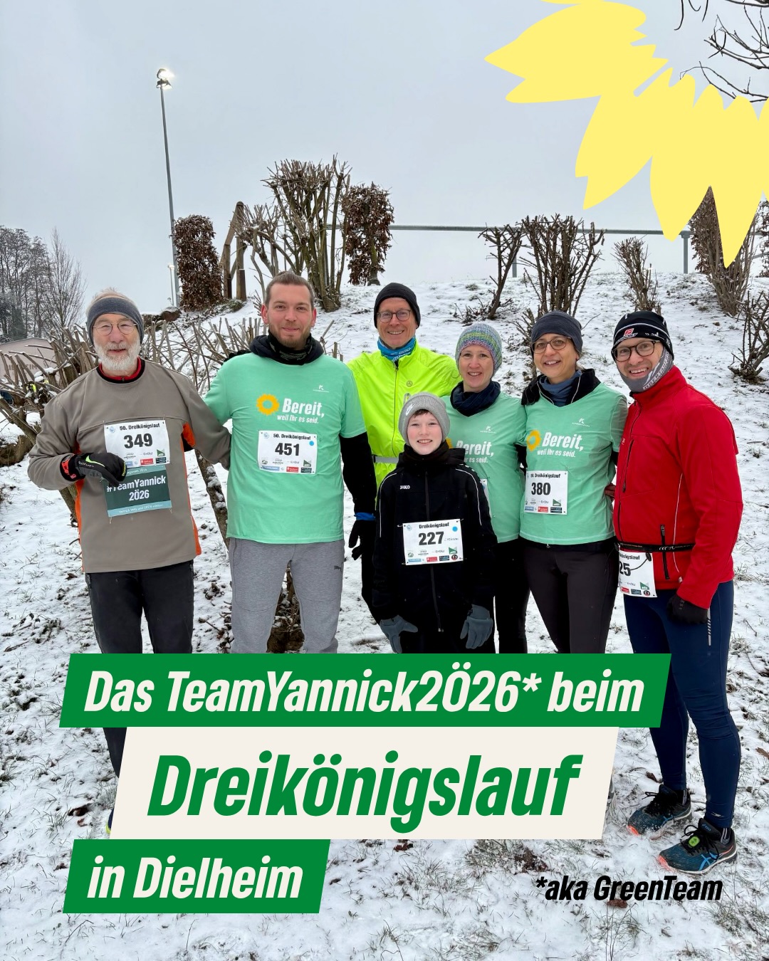 Das GreenTeam nahm am Dielheimer Dreikönigslauf unter dem Motto #TeamYannick2026 teil. Zusammen mit dem Nußlocher Landtagskandidaten Yannick Veits sowie zahlreichen engagierten Mitstreitern aus der gesamten Region präsentierte sich die Gruppe sportlich aktiv. Zum Team gehörten unter anderem Andrea Just, Marion Schmidt mit ihrem Sohn, Gerhard Gebhard und Sebastian Winter aus Wiesloch, Ralf Kau aus Tairnbach sowie Philip Weiß aus Sandhausen, der offiziell für das TeamChaos an den Start ging.