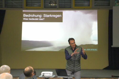 Hendrik Müller verdeutlichte, warum die AG Schwammstadt die Vorsorge vor Starkregenereignissen ins Zentrum stellt: In Sandhausen ist mehr als ein Drittel der Bevölkerung von Überflutungsrisiken betroffen. Mit Luftaufnahmen zeigte er positive wie negative Beispiele für Regenwasserrückhaltung. Die AG setzt auf Nachbarschaftshilfe, praktische Anschauungsprojekte und unabhängige Tipps für Hausbesitzer.