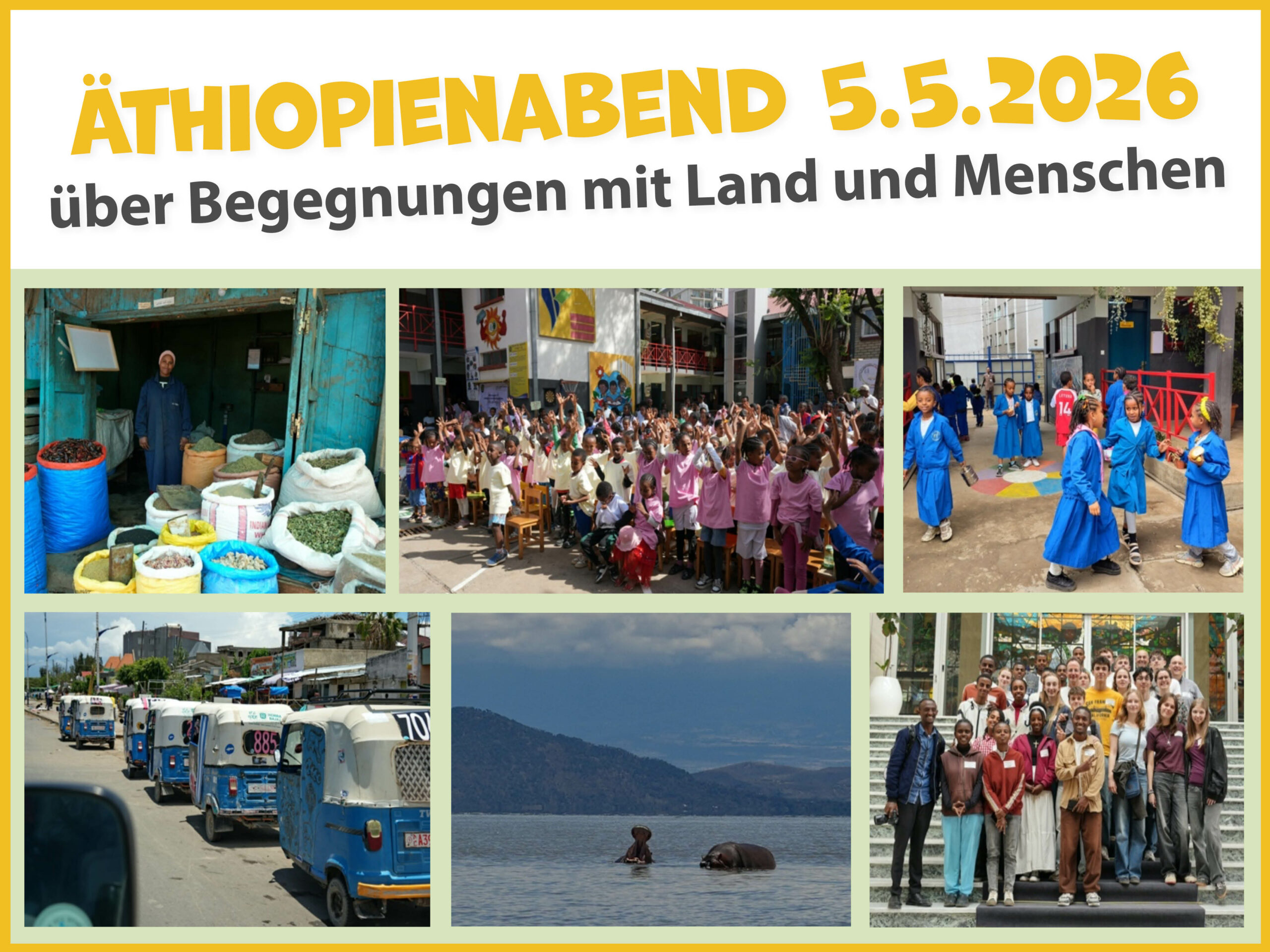 Wir laden Sie herzlich zu einer kurzweiligen Äthiopien-Präsentation ein, in der wir Ihnen unsere 20-jährige Schulpartnerschaft, das Land sowie unsere vielfältigen Aktivitäten vorstellen möchten. Diese reichen von gemeinsamen Unternehmungen mit Schüler*innen und Lehrkräften der GCS über Ausflüge in die Umgebung, Vorträge und Besuche bei den United Nations, in der Deutschen Botschaft, bei der Gesellschaft für Internationale Zusammenarbeit (GIZ) bis hin zu Besuchen bei Nichtregierungsorganisationen wie „Brot für die Welt“.