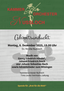 Das Kammerorchester Nußloch und Dirigent Timo Jouko Herrmann laden zusammen mit Pfarrerin Oda Mezler recht herzlich zur musikalischen Adventsandacht am Montag, den 8. Dezember 2025