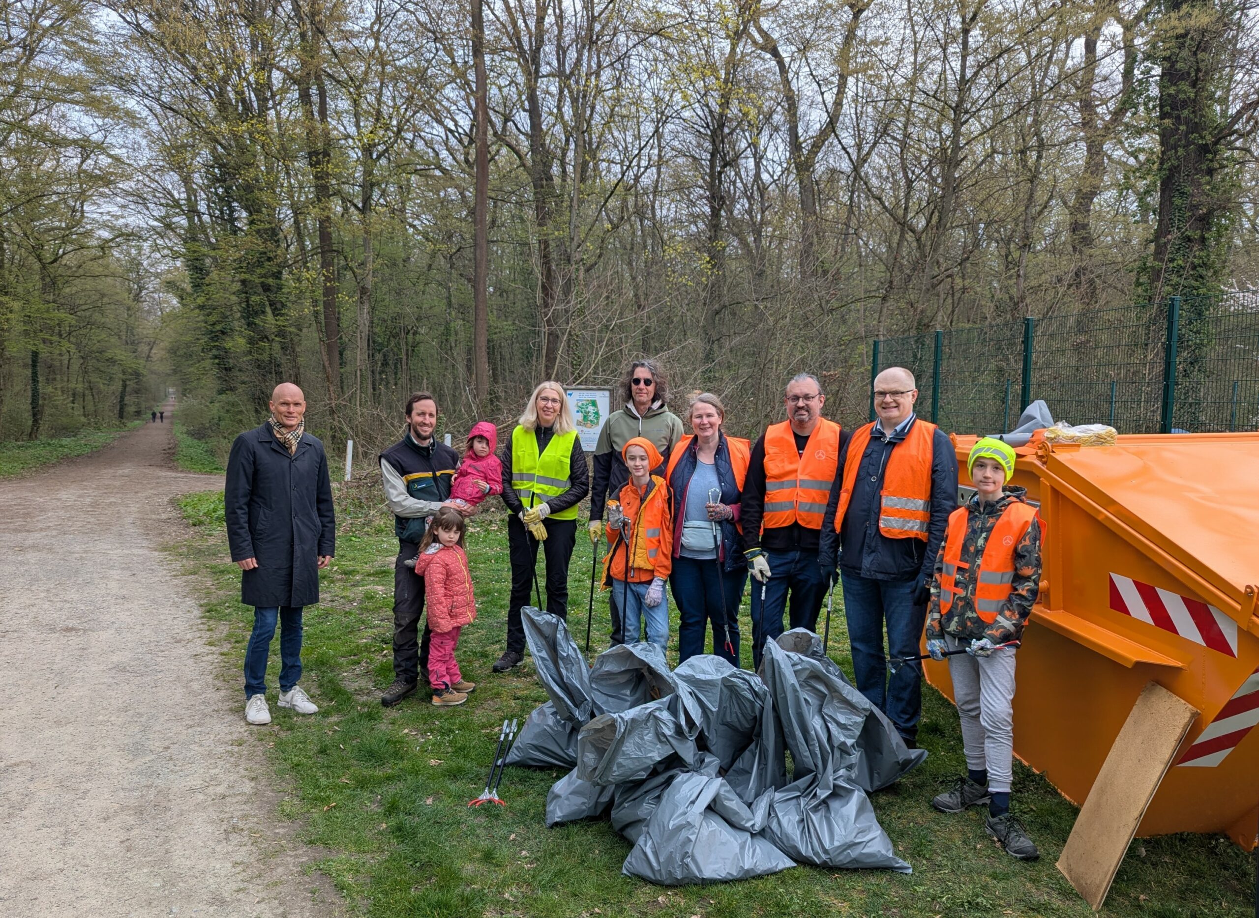 Nach etwa einer Stunde kamen alle wieder am Ausgangspunkt zusammen, um eine kurze Pause einzulegen. In dieser Zeit stieß auch Oberbürgermeister Dirk Elkemann zur Gruppe. Er bedankte sich herzlich für das Engagement der Anwesenden und unterstrich die große Bedeutung des Dämmelwaldes für die Stadt Wiesloch. Im Anschluss ging es motiviert in die zweite Runde. Während sich eine Gruppe weiter am Waldrand Richtung Osten vorarbeitete, nutzte die andere, die zunächst den kürzeren Abschnitt übernommen hatte, die Gelegenheit, eine Runde durch den Wald zu drehen. Dort zeigte sich erfreulicherweise ein deutlich geringeres Müllaufkommen. Anschließend wurde noch der Bereich rund um den Waldspielplatz gründlich gesäubert, bevor sich beide Gruppen wieder aufeinander zubewegten.