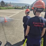 Später folgte für diese Gruppe der praktische Teil, bei dem die Jugendlichen die Strahlrohre und Schläuche selbst ausprobierten. Ein besonderer Höhepunkt war das Testen der verschiedenen Wasserwurfweiten der Strahlrohre. Mit großem Geschick versuchten die Jugendlichen zudem, Tennisbälle von aufgestellten Pylonen herunterzuschießen, was für viel Begeisterung und Freude in der Gruppe sorgte.