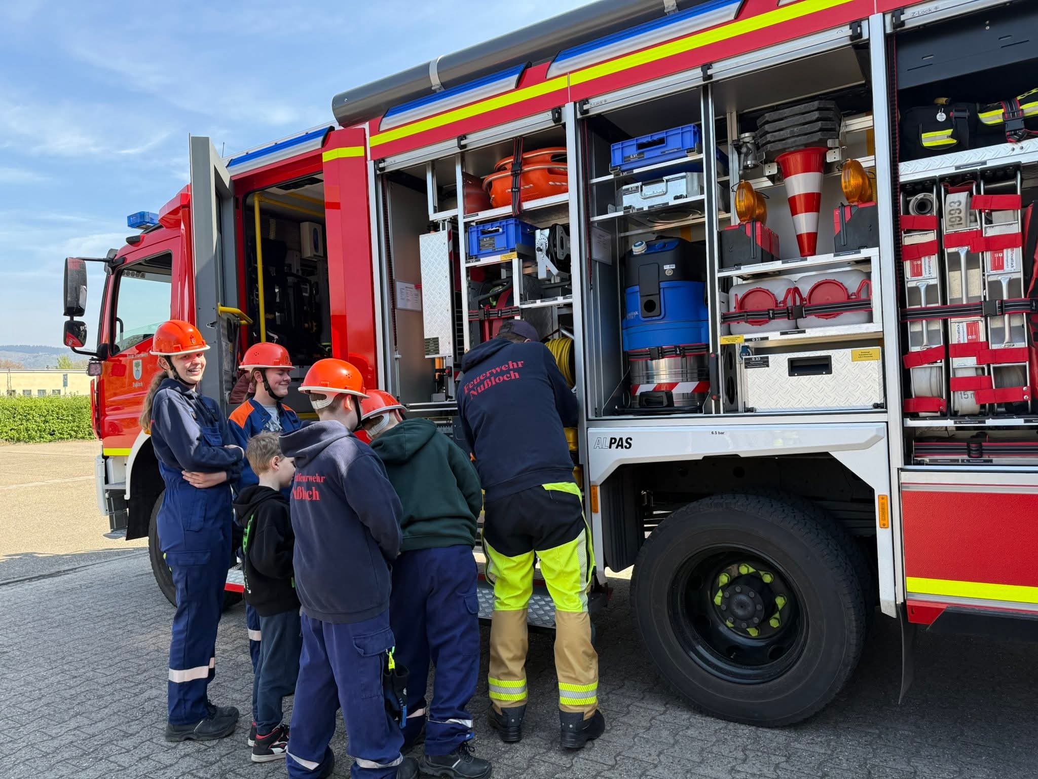 Im weiteren Verlauf wurden die Teilnehmenden in zwei Arbeitsgruppen aufgeteilt. Die erste Gruppe widmete sich intensiv der Fahrzeugkunde. Im Fokus stand dabei die Frage, welche Geräte und Materialien auf den einzelnen Fahrzeugen verladen sind und welchen Zweck diese im Einsatz erfüllen. Die Jugendlichen hatten die Gelegenheit, die Ausrüstung aus nächster Nähe genau zu betrachten und die konkrete Anwendung im Ernstfall ausführlich zu besprechen.