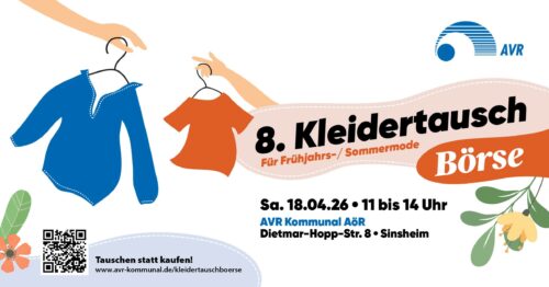 (avr 2.4.26) Mit dem Start in die wärmere Jahreszeit lädt die AVR Kommunal erneut zur Kleidertauschbörse nach Sinsheim ein. Am Samstag, 18. April 2026, findet die Veranstaltung von 11 bis 14 Uhr bereits zum achten Mal im Verwaltungsgebäude in der Dietmar-Hopp-Straße statt.