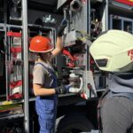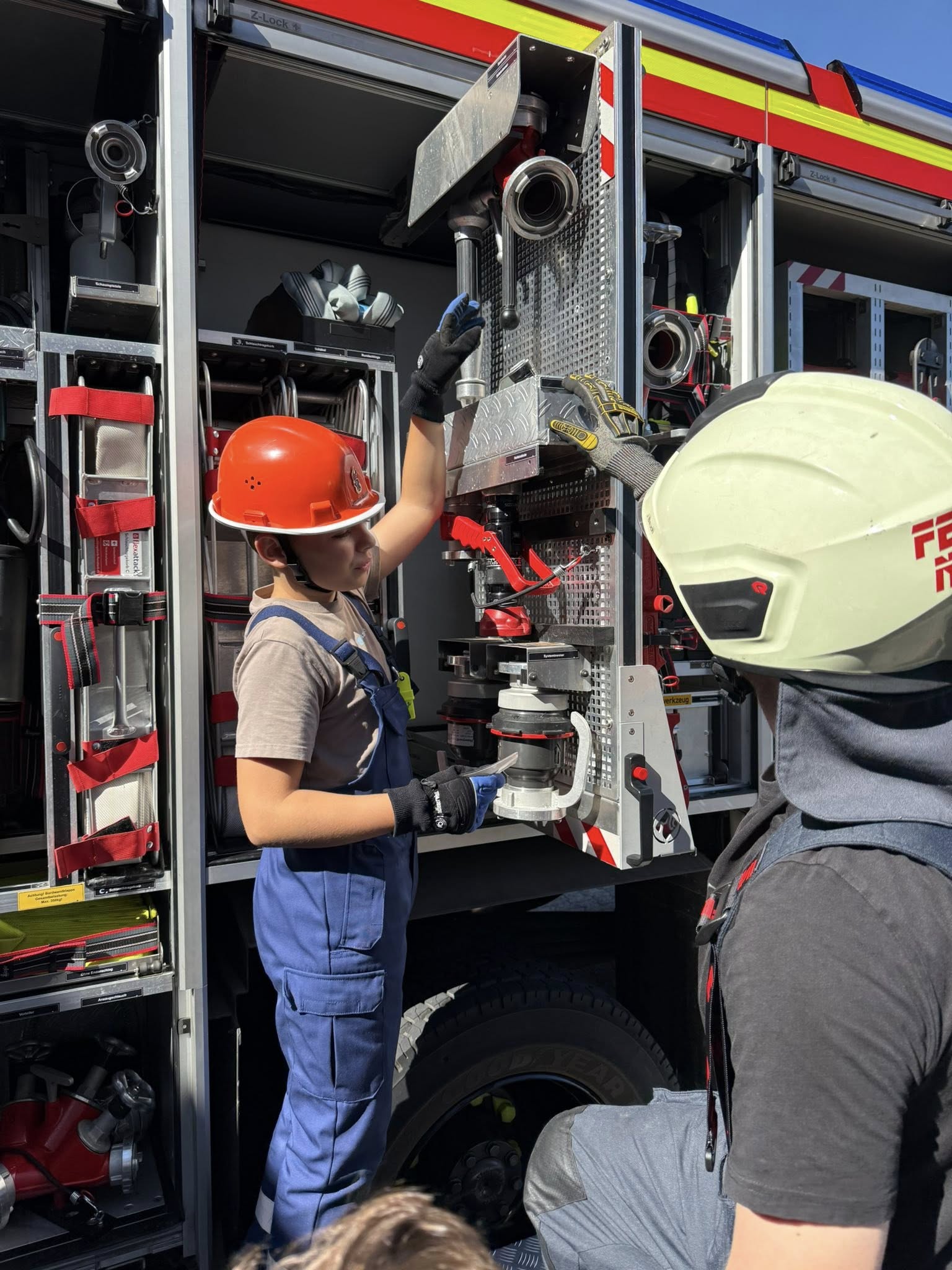 Besonderes Augenmerk legten die Betreuer auf die Fahrzeugkunde. Gemeinsam nahmen die Jugendlichen das Löschfahrzeug LF10 genau unter die Lupe. Dabei wurde geklärt, wo Feuerlöscher, Schaumstrahlrohre, Saugschläuche, Systemtrenner oder Leitern verladen sind. Denn am Einsatzort zählt jede Sekunde – jeder Handgriff muss sitzen, damit keine Zeit verloren geht.