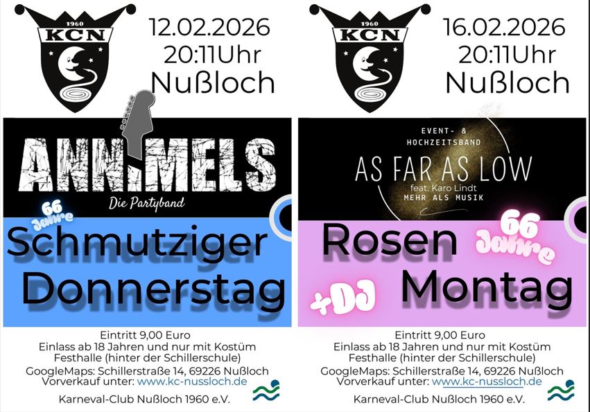 Am 12. Februar 2026 um 20:11 Uhr steigt in der Festhalle Nußloch (hinter der Schillerschule) die große Party zum Schmutzigen Donnerstag. Die ANNIMELS, bekannt als eine der besten Partybands, sorgen für ausgelassene Stimmung und garantieren einen unvergesslichen Faschingsabend.