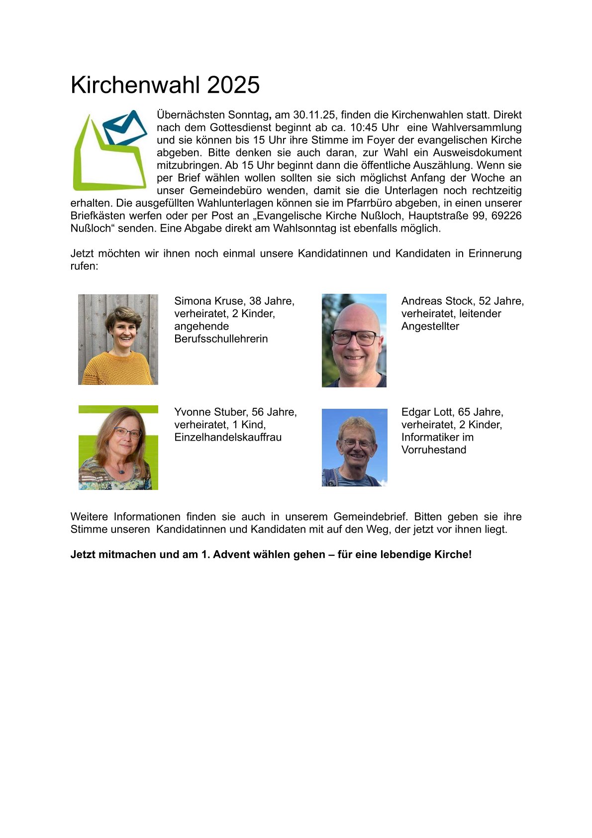 10:45 bis 15:00 Uhr Kirchenwahl im Foyer der Kirche. Wir beginnen nach dem Gottesdienst. Bitte bringen Sie einen Personalausweis mit.