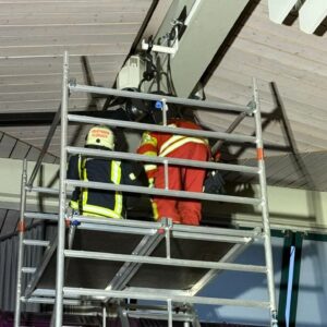 Zusammen mit dem Hausmeister stellten die Einsatzkräfte ein Gerüst, um die beschädigte Lampe gefahrlos zu demontieren. Ein hinzugezogener Elektriker aus dem Ort führte anschließend eine Kontrolle der elektrischen Anlage durch, um weitere Gefahrenquellen auszuschließen. Bürgermeister Joachim Förster sowie Bauamtsleiter Matthias Leyk machten sich an der Einsatzstelle ein Bild von der Situation und den durchgeführten Maßnahmen.