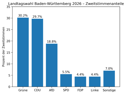 (mar 9.3.26) Bei der Landtagswahl am 8. März 2026 in Baden-Württemberg haben die Wählerinnen und Wähler ein knappes Ergebnis hervorgebracht. Bündnis 90/Die Grünen wurden mit 30,2 Prozent der Zweitstimmen stärkste Kraft und lagen damit knapp vor der CDU, die 29,7 Prozent erreichte. Drittstärkste Partei wurde die AfD mit 18,8 Prozent. Die SPD kam nur noch auf 5,5 Prozent und erreichte damit ihr historisch schwächstes Ergebnis in Baden-Württemberg.