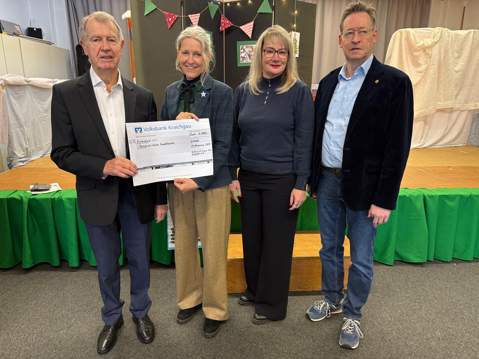 Die offizielle Übergabe der Spende fand im Rahmen der jährlichen Weihnachtsfeier der Pestalozzischule statt. Die Schülerinnen und Schüler sorgten mit einem kleinen Theaterstück und gemeinsam gesungenen Weihnachtsliedern für ein stimmungsvolles Programm auf der Bühne. In diesem festlichen Rahmen überreichte der Schatzmeister des Lions Club Leimen, Heinz Thoman, den Spendenscheck an die Rektorin der Pestalozzischule, Frau Senzig.