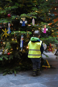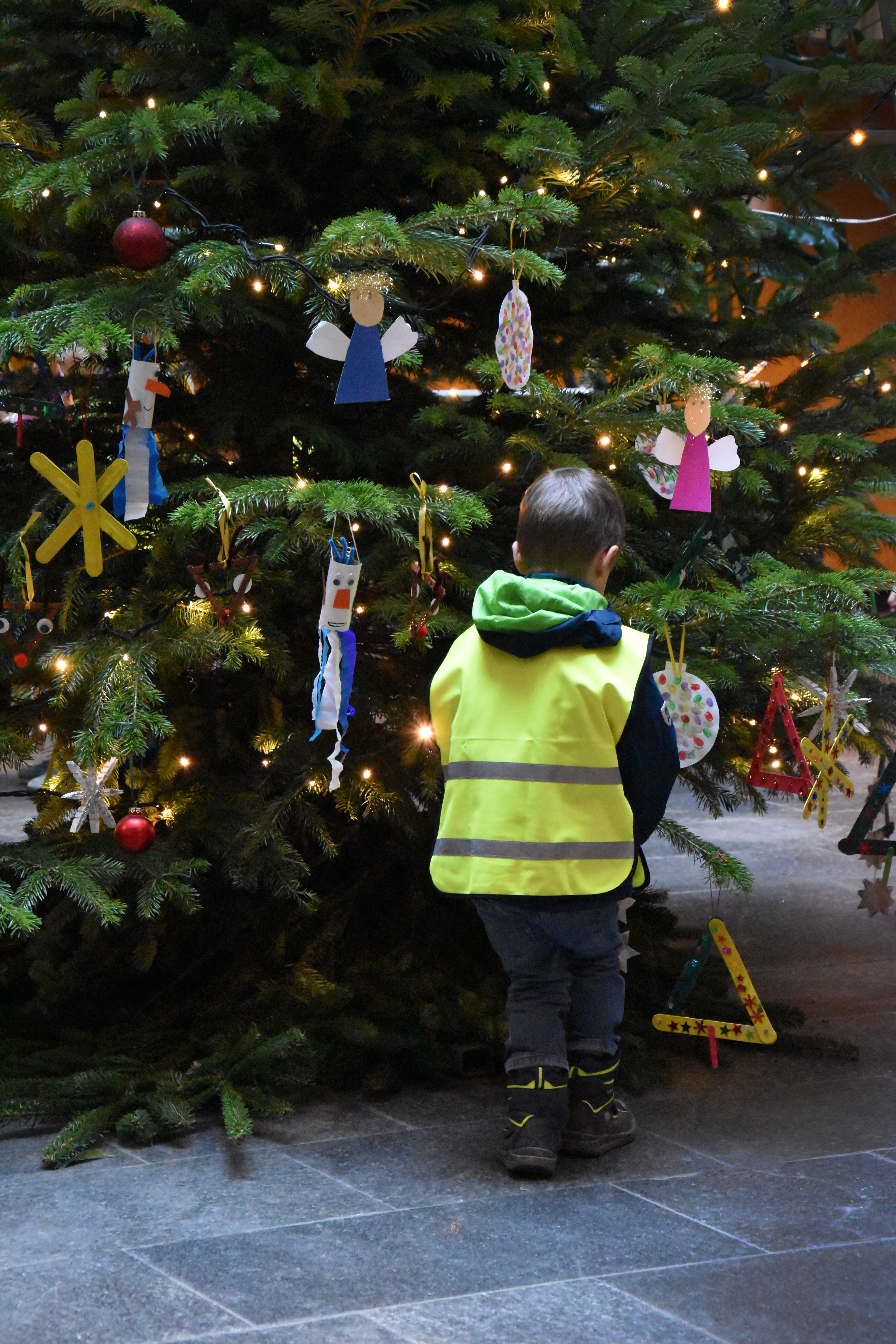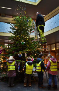 Völlig zu Recht begutachteten die Vorschulkinder des Waldkindergartens ihr Werk mit Stolz. Bis ins kleinste Detail ausgearbeiteter Baumschmuck wurde seit Tagen von den kreativen Künstlerinnen und Künstlern für diesen Tag vorbereitet und konnte endlich an den noch so leeren Tannenbaum, der mitten im Rathaus wartete, gehängt werden.