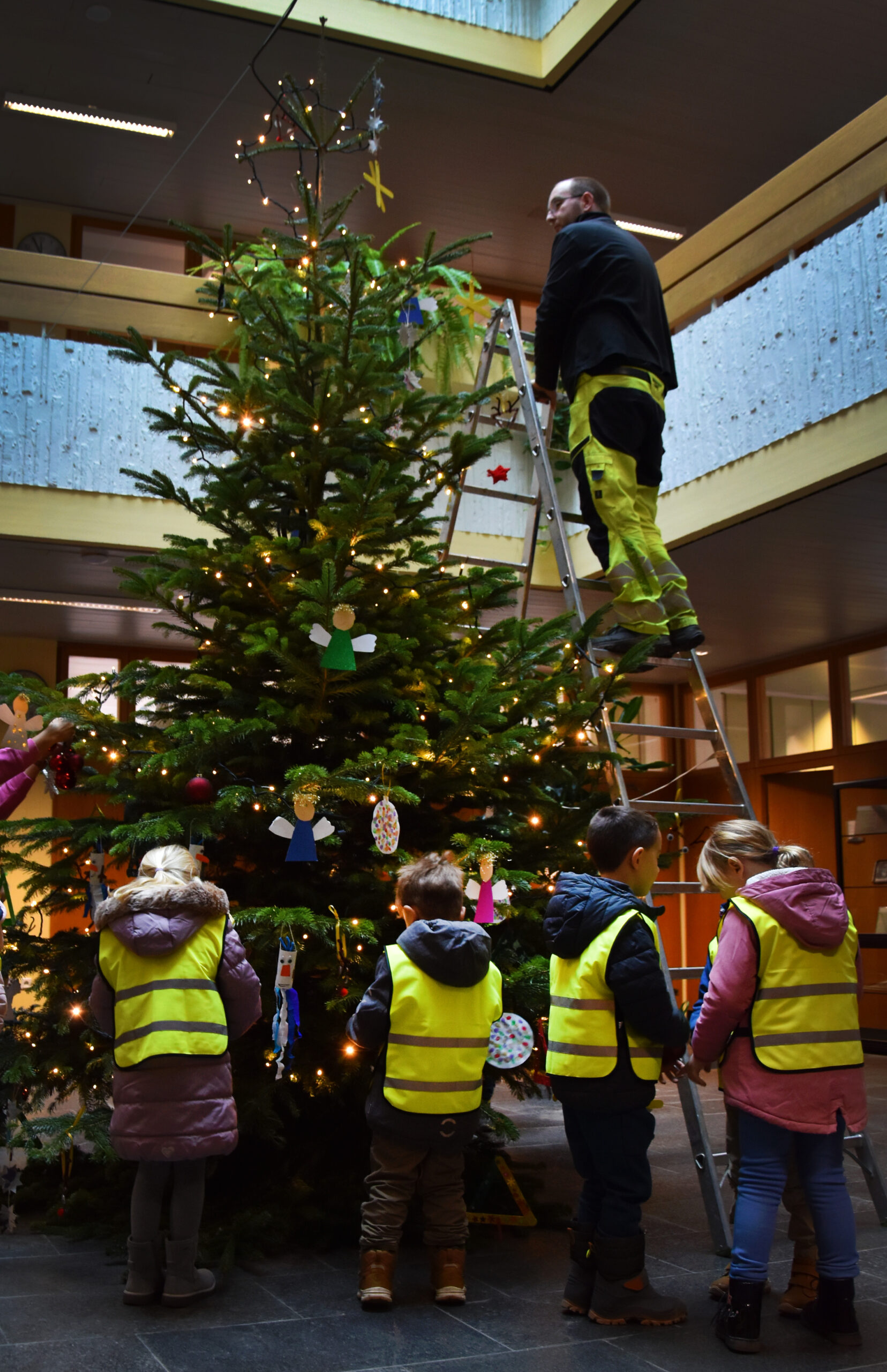 Das Team vom Bauhof hatte das vier Meter hohe Prachtstück bereits kurz zuvor kerzengerade im Atrium platziert. Die fröhlichen Kinderstimmen hüllten das Gebäude in Windeseile in vorweihnachtliche Stimmung. Und Dank des individuellen, farbenfrohen Schmuckes, der ihn nun ziert, prunkt er an zentraler Stelle und erfreut alle Gäste des Rathauses sowie das gesamte Team der Gemeindeverwaltung, einschließlich des Bürgermeisters Hakan Günes