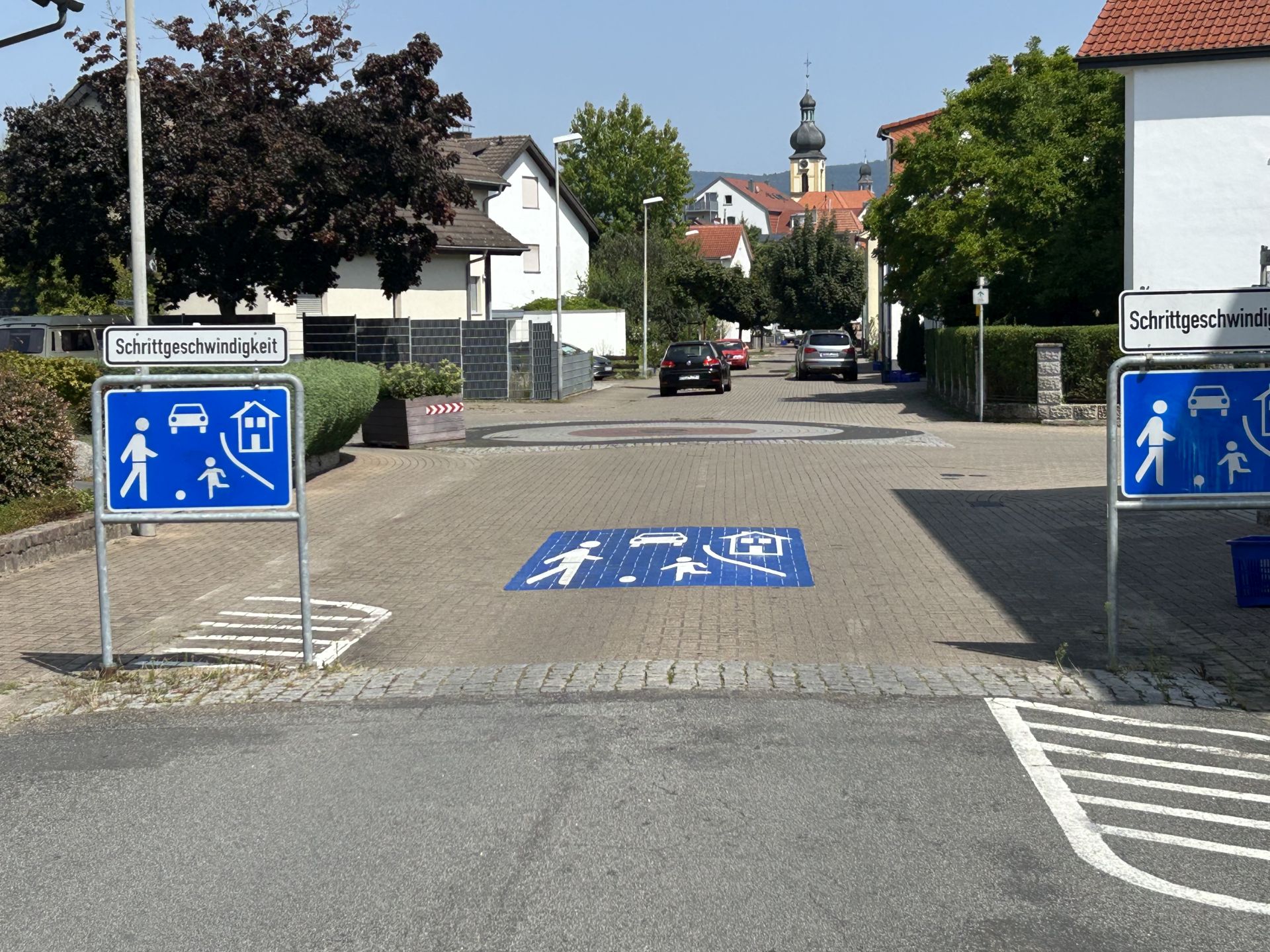 - „Schrittgeschwindigkeit“ heißt es in der Schulstraße – das Piktogramm weist auf die verkehrsberuhigte Maßnahme hin. Fotos: Gemeinde Sandhausen