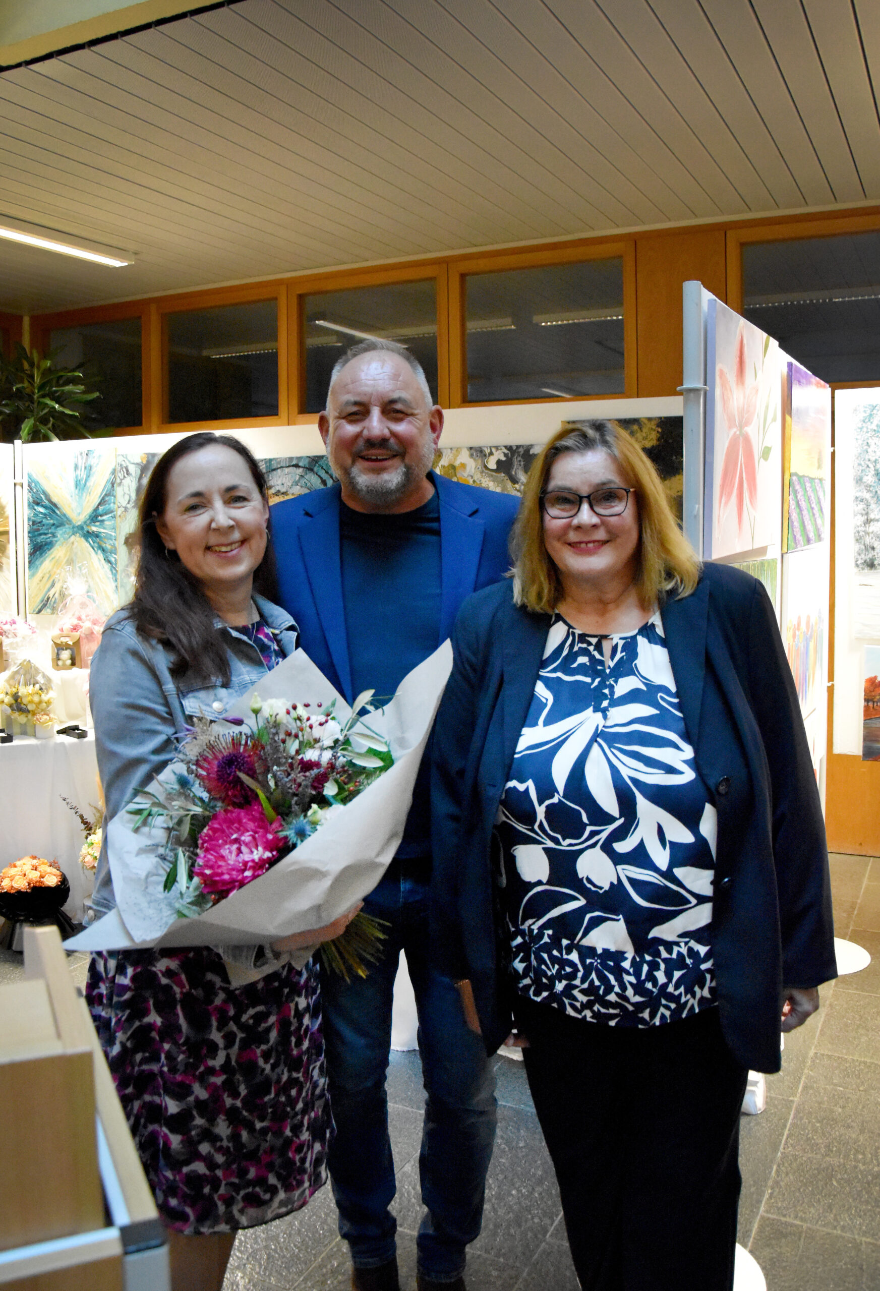 Andrea Hilbert, Uwe Herzog und Marion Kral freuten sich über den Zulauf am Freitagabend zur Eröffnung der Hobbykünstlerausstellung. Foto: Gemeinde Sandhausen