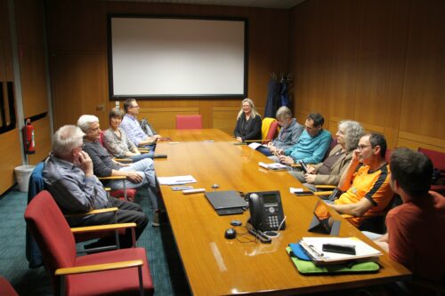 Die Vertreter der Arbeitsgruppen der Klimawerkstatt besprechen mit Michael Boeke (r.) von der KLiBA und mit Dr. Werner Krause (l.), Klimamanager der Gemeinde Sandhausen, die nächste Agenda. Gast ist Stefanie Damblon (5. v. l) von der KLiBA. die im Rathaus alle zwei Wochen eine Beratung durchführt. Foto: Gemeinde Sandhausen