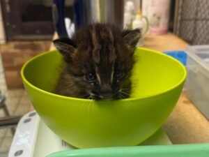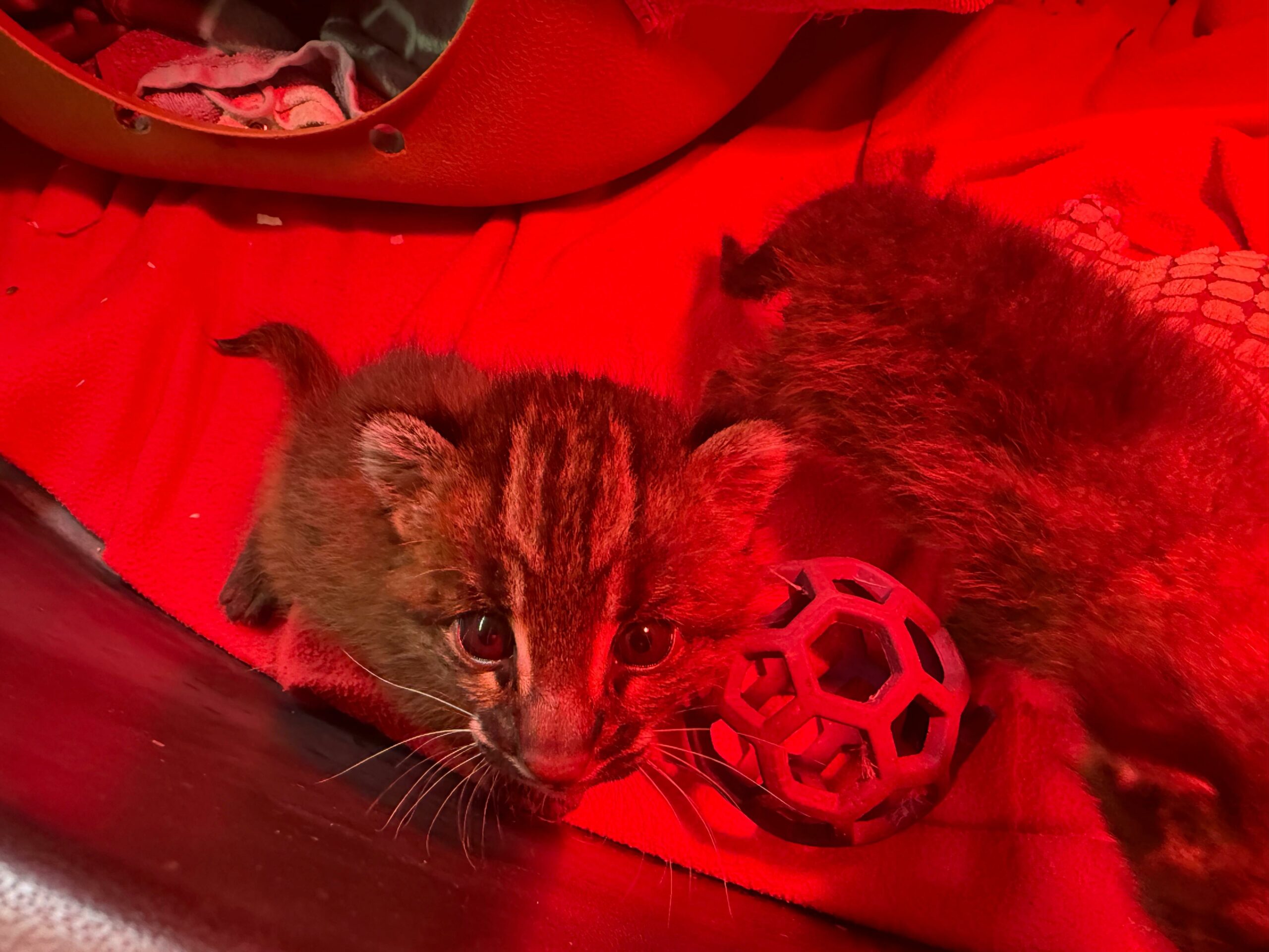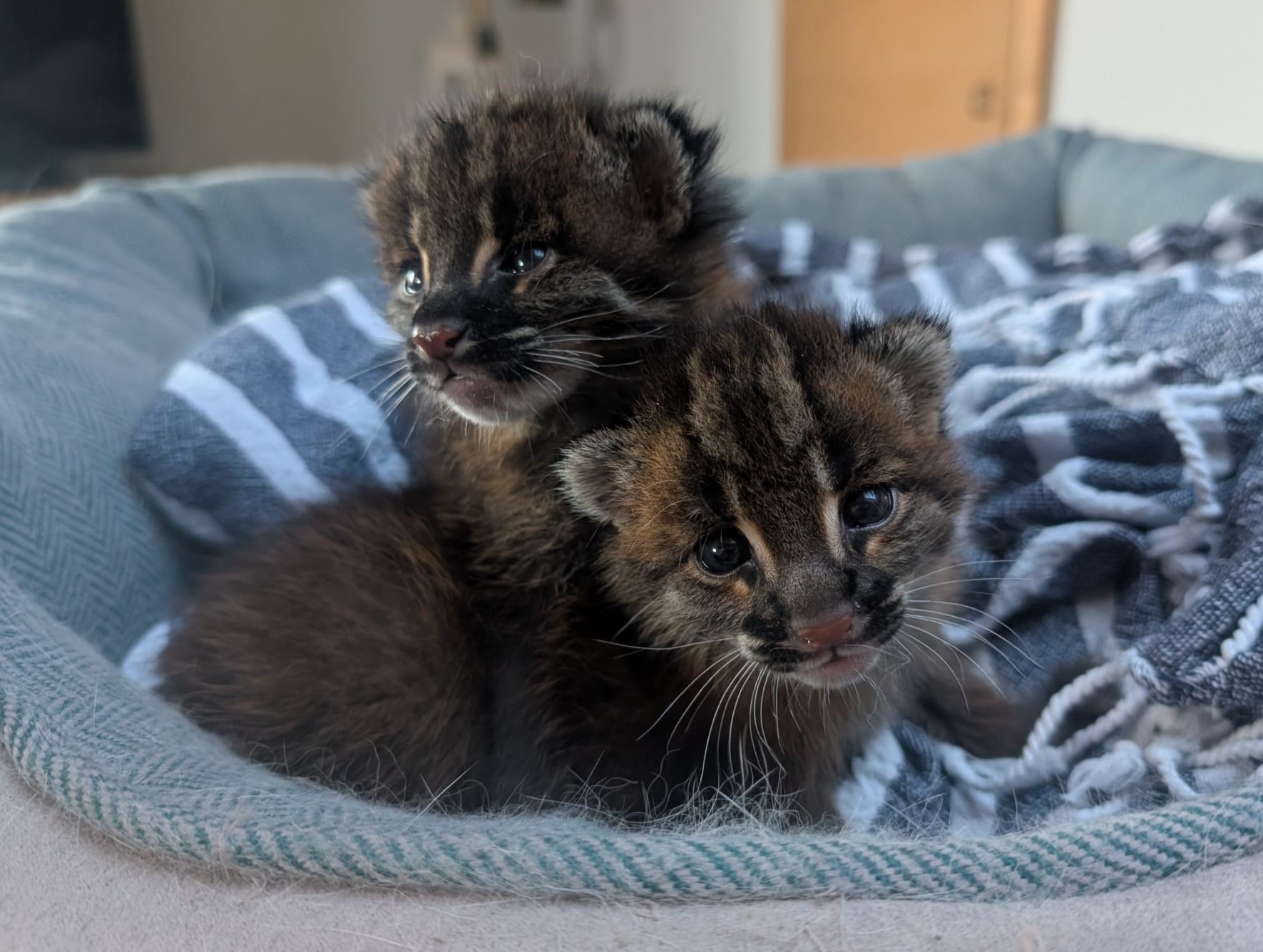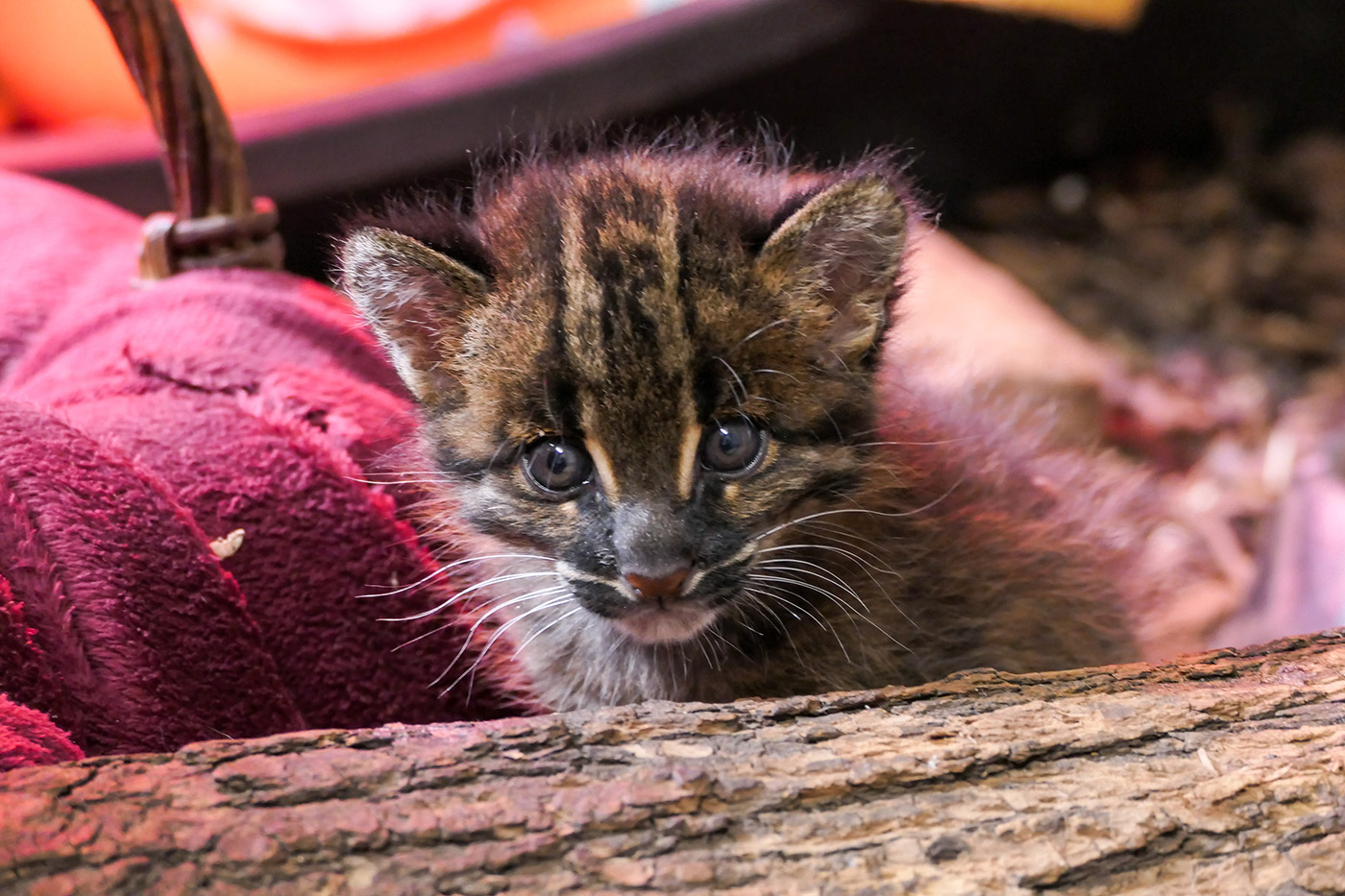 Die Aufzucht erforderte in den ersten Wochen großen Einsatz: Rund um die Uhr versorgte ein Team aus Tierpflegern, Tierärztin und Kuratorin die Jungtiere, anfangs im Zwei- Stunden-Takt – auch nachts. Die Tiere hatten kurz nach der Geburt ein Gewicht von rund 150 Gramm, die Augen waren die ersten zwei Wochen noch geschlossen. „Inzwischen haben die kleinen Goldkatzen die Augen geöffnet und beide fressen bereits Fleisch.“, erklärt Bianca Weißbart, Leiterin des Raubtierreviers. Der Kontakt zum Menschen wird bewusst auf ein Minimum reduziert, um Fehlprägungen zu vermeiden. Auch deshalb ist es sehr wichtig, dass die beiden Jungtiere gemeinsam aufwachsen und so wichtigen Sozialkontakt untereinander haben.