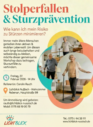 Die Zahlen sprechen eine deutliche Sprache: Etwa jeder dritte Mensch über 65 Jahre stürzt mindestens einmal pro Jahr. Was viele nicht wissen – die meisten dieser Unfälle passieren nicht auf vereisten Gehwegen oder steilen Treppen, sondern in den eigenen vier Wänden. Genau hier setzt der Workshop an, den das Lichtblick Nußloch für den 27. Februar organisiert hat.