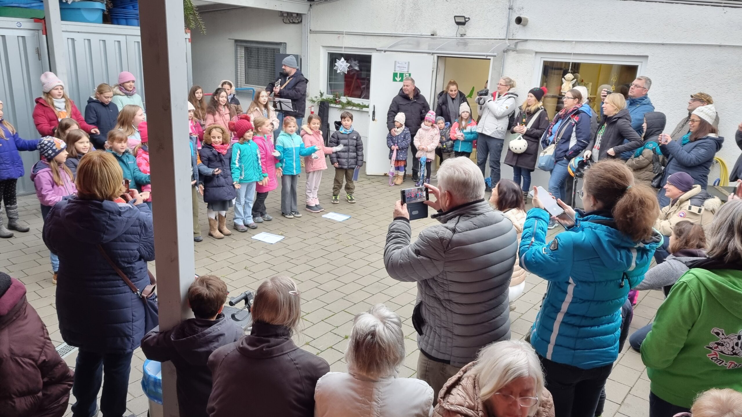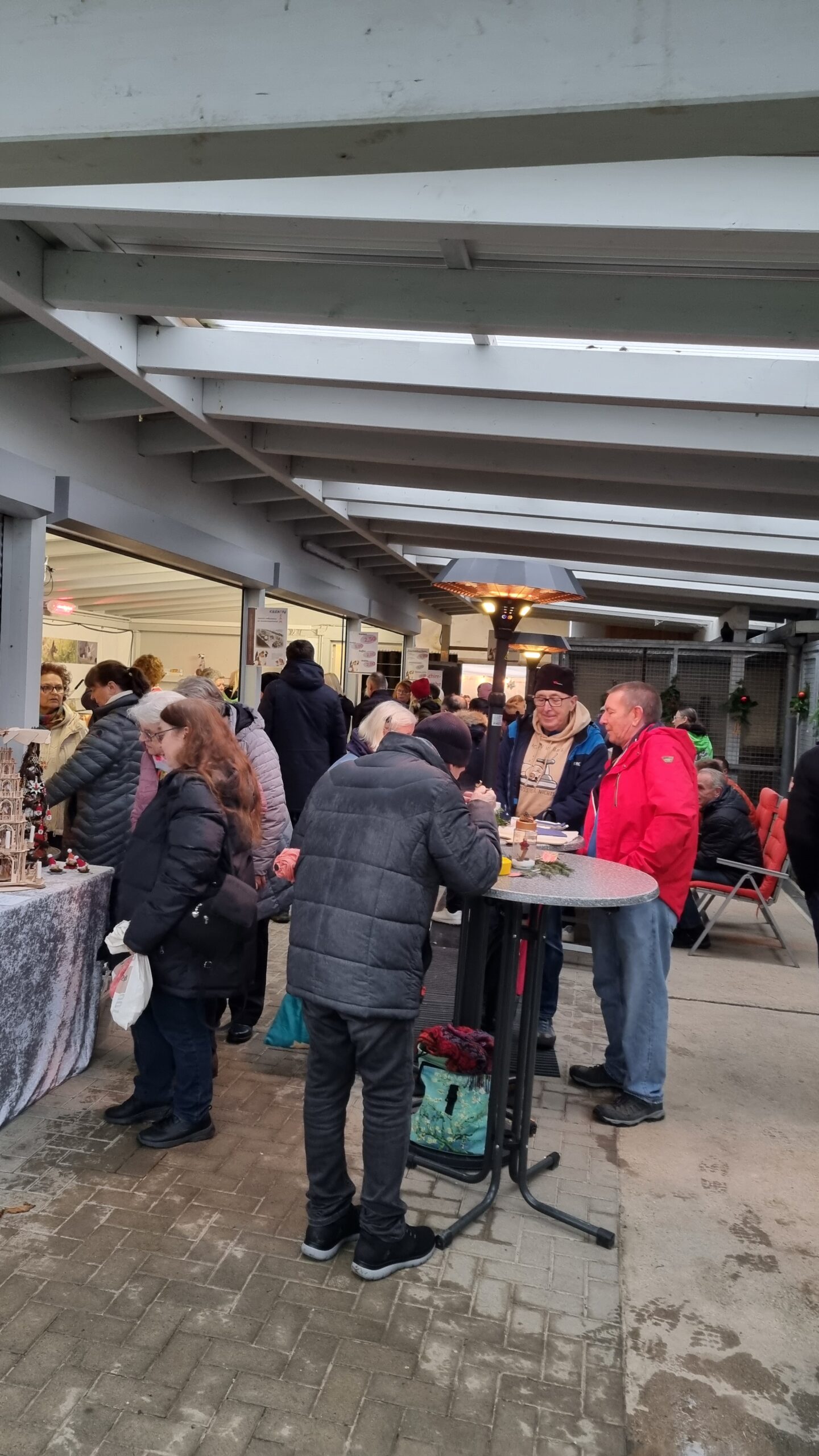 Es herrschte reges Treiben den ganzen Tag lang. Gut gelaunte Gäste genossen an der Eventhalle den überdachten Bereich, probierten Flammkuchen und Waffeln und stöberten am Kreativstand. „Bei euch ist es einfach immer schön,“ hörte man eine Besucherin sagen. „Überdacht, warm, gutes Essen und meine Frau kann shoppen – perfekt,“ ergänzt ein Herr lachend, während er auf seinen Flammkuchen wartet. „Ich bin aus Karlsruhe gekommen und wollte mal sehen, ob das Wetter hier besser ist.“ Die lockere und fröhliche Stimmung war überall spürbar. Der Tierschutzverein hatte im hinteren Bereich beheizte Sitzmöglichkeiten geschaffen. Dort trat am Nachmittag der Kinderchor „Sound meets Voices“ von der Waldschule in Walldorf auf. Die jungen Sängerinnen und Sänger präsentierten ihre Lieder voller Elan – ganz ohne Liedtextzettel – sie hatten fleißig geübt. Frau Bienhaus, die Leiterin der Musik AG, war sichtlich stolz auf ihre Gruppe.