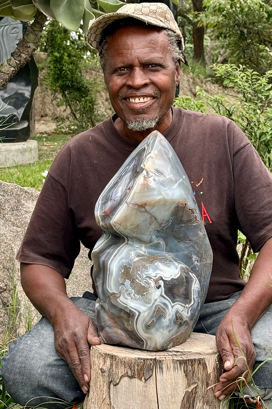 Die Bearbeitung erfolgt vollständig in Handarbeit. Dabei entwickelt sich aus dem rohen Stein nach und nach eine persönliche Skulptur. Nach der Formgebung wird die Oberfläche mit Wasser und Schleifpapier geglättet. Abschließend wird das Werk erhitzt und mit farblosem Wachs poliert. Dieser Prozess verleiht dem Stein seine charakteristische glänzende Oberfläche und hebt die natürliche Maserung besonders hervor.