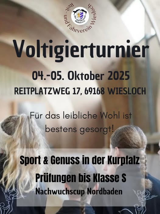 Am ersten Oktoberwochenende richtet der Reitverein Wiesloch sein Voltigierturnier aus. An beiden Tagen stehen Prüfungen bis zur höchsten nationalen Kategorie, der Leistungsklasse S, auf dem Programm.