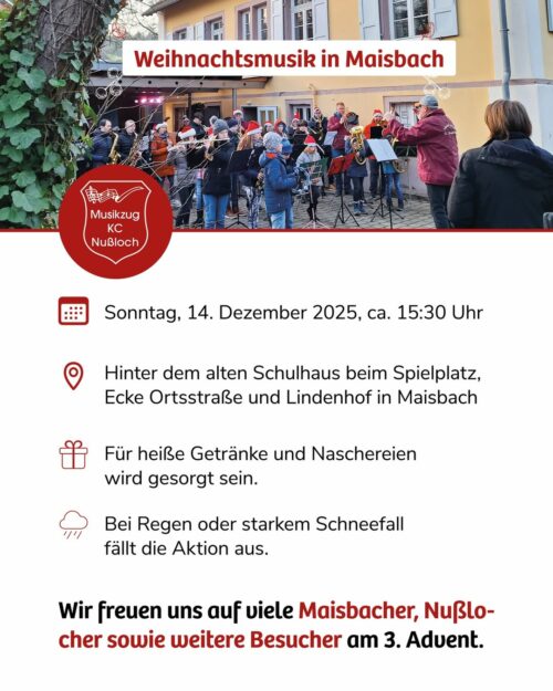 Am 3. Advent lassen wir wieder weihnachtliche Töne in Maisbach erklingen. Kommt vorbei, hört zu, singt mit und nascht leckeres Gebäck bei einer warmen Tasse Punsch oder Glühwein. Wir freuen uns auf euch.