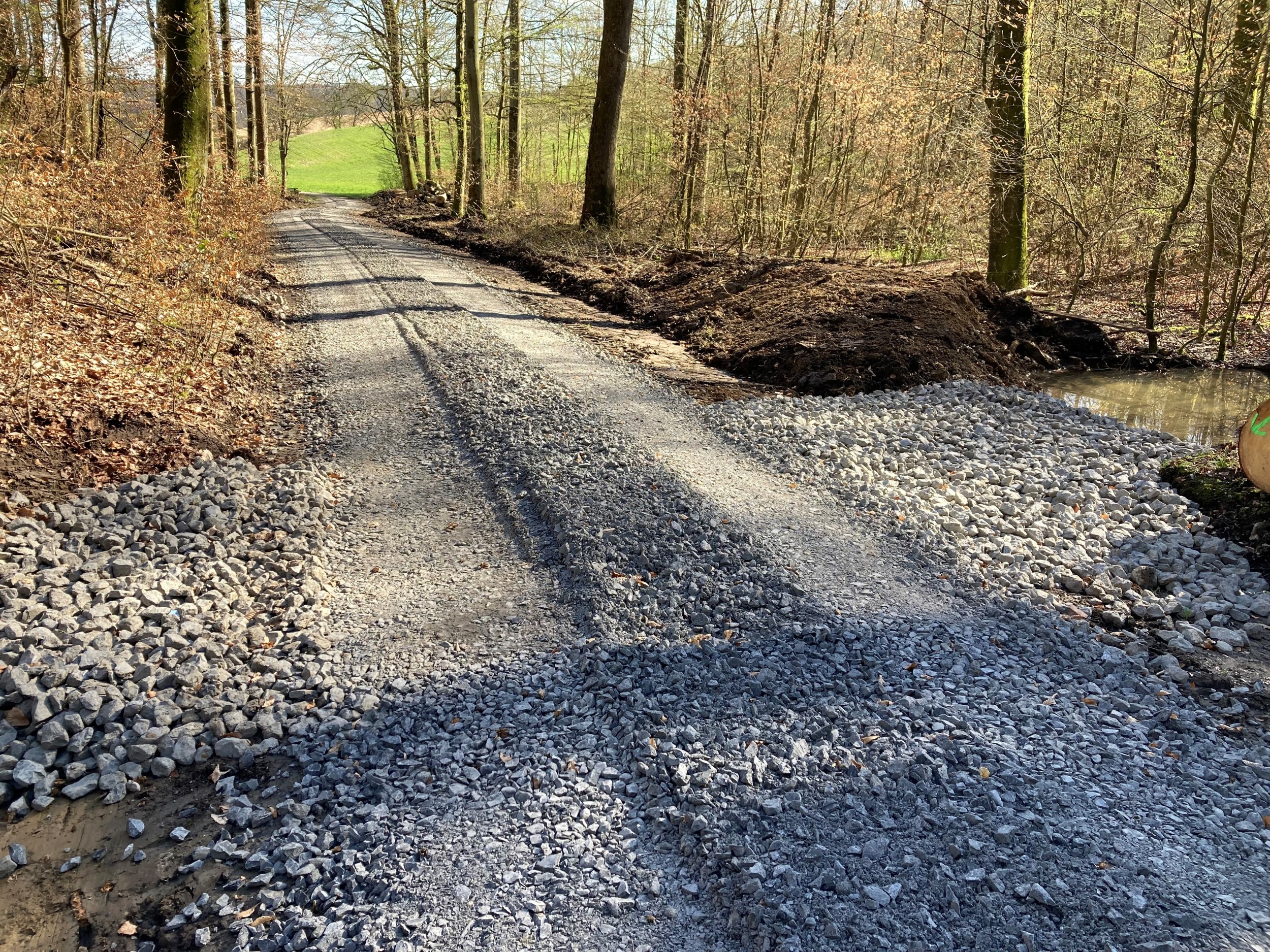 „Die richtige Anlage von Forstwegen und Rückegassen ist entscheidend für einen geregelten Wasserabfluss im Wald“, erklärt Forstbezirksleiter Philipp Schweigler. Wasser aus Wegeseitengräben sollte möglichst in den Bestand geleitet werden. Auch der Ersatz von Dolen durch Rigolen oder Furten kann sinnvoll sein. Rigolen nehmen Wasser auf und lassen es kontrolliert versickern, Furten leiten es oberirdisch durch seichte Vertiefungen. Beide Varianten verlangsamen den Abfluss, fördern die Versickerung und reduzieren Erosionsschäden.