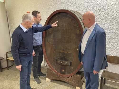 (pm 12.2.26) Ein besonderes kulturhistorisches Objekt hat nun dauerhaft seinen Platz im Wieslocher Rathaus gefunden: Der Fassboden, den der berühmte Afrikaforscher Georg August Schweinfurth im 19. Jahrhundert dem Heidelberger Schloss schenkte, befindet sich seit Kurzem im zweiten Untergeschoss des Rathauses und ist dort für Besucherinnen und Besucher frei zugänglich.