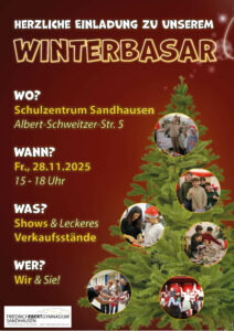 Organisiert wird der Winterbasar in bewährter Weise von den Schülerinnen und Schülern sowie deren Eltern – mit viel Kreativität, Engagement und Herzblut. An zahlreichen Ständen gibt es Selbstgebasteltes, Kulinarisches und kleine Überraschungen zu entdecken. Für Unterhaltung und eine festliche Stimmung ist ebenso gesorgt wie für gemütliche Begegnungen in familiärer Atmosphäre.
