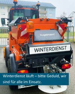 Sollte es in einzelnen Straßen zu Verzögerungen kommen, bittet die Gemeinde um Verständnis und Nachsicht. Die Einsatzkräfte sind kontinuierlich für alle Bürgerinnen und Bürger unterwegs.