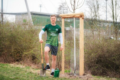 Baumpflanzung an der VfL-Allee am 24. März 2026. VfL-Spieler Yannick Gerhardt trägt dabei ein Sondertrikot mit NABU-Logo. Foto: Thomas Margraf/VfL Wolfsburg via Pressemitteilung